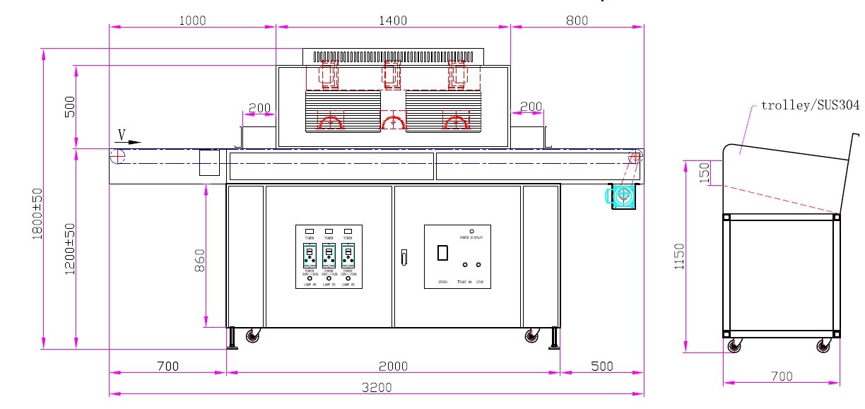 2. UV燈尺寸:總長(zhǎng)度850毫米,弧長(zhǎng)750毫米