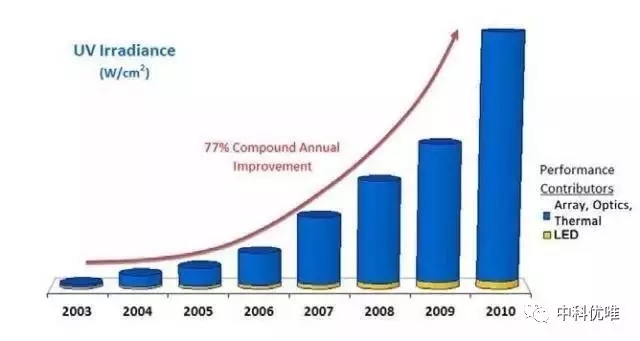 uvled光固化機的輸出功率在最近幾年得到了相當大的提高,從若干家供應商所提供的產品指標數據可以看出,從2005年到2011年輸出功率的復合年均增長率在5%到10%之間。但對于LED整體表現的評估,另外三個因素對于增加LED的效能更加重要:陣列、冷卻和光學系統。