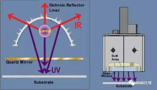 基于最終的應用需求,光學工程師必須決定應該采用何種形狀、形式以及材質來最好地利用LED的獨特性能,然后還需要注意LED是一種泛光形式的光,而不像汞燈模式中紫外光被反射罩反射并指向特定的點并具有一定的聚焦長度。下圖標出了傳統汞燈和UV LED燈在這一點上面的不同。