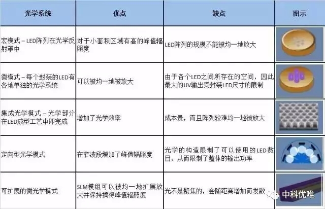 UV LED光源的效能。對于UV LED供應商所采用的幾種典型光學方法及其優缺點的匯總見下表。